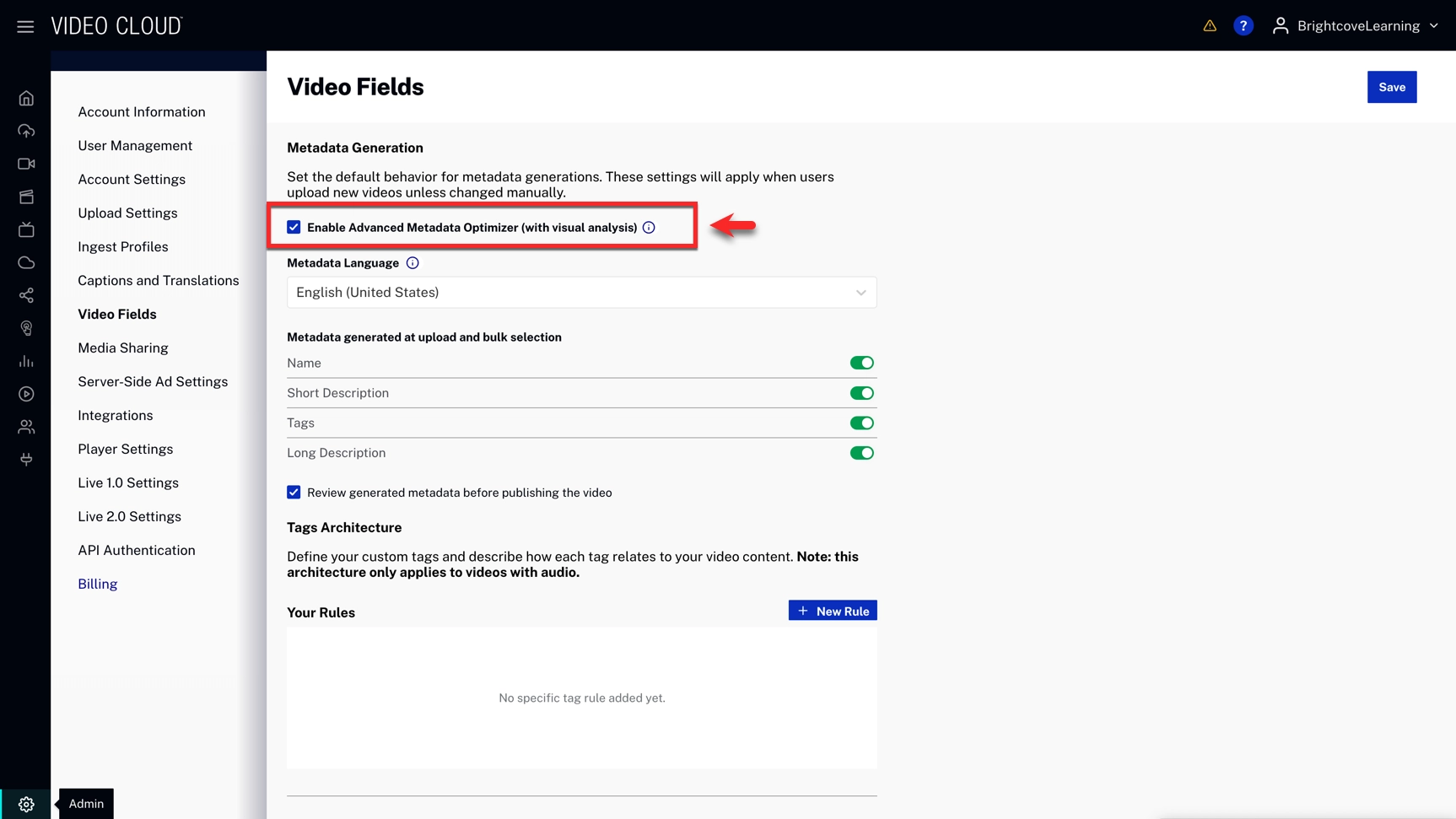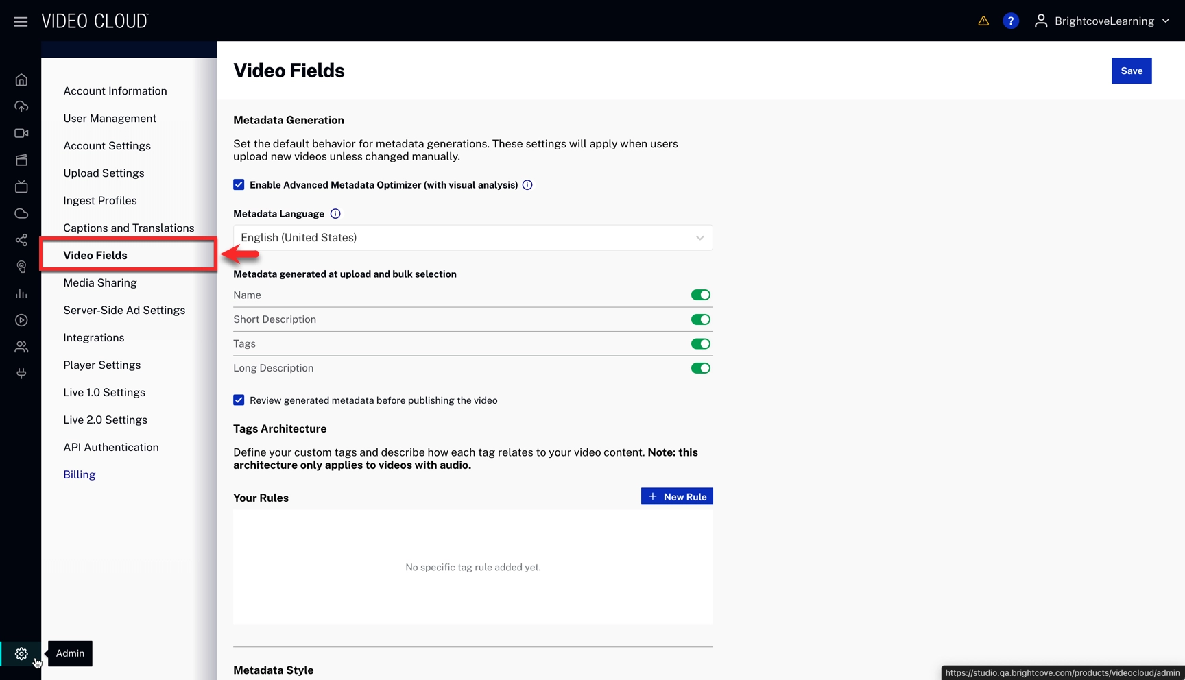 - In the Admin module, select Video Fields → Metadata Generation.