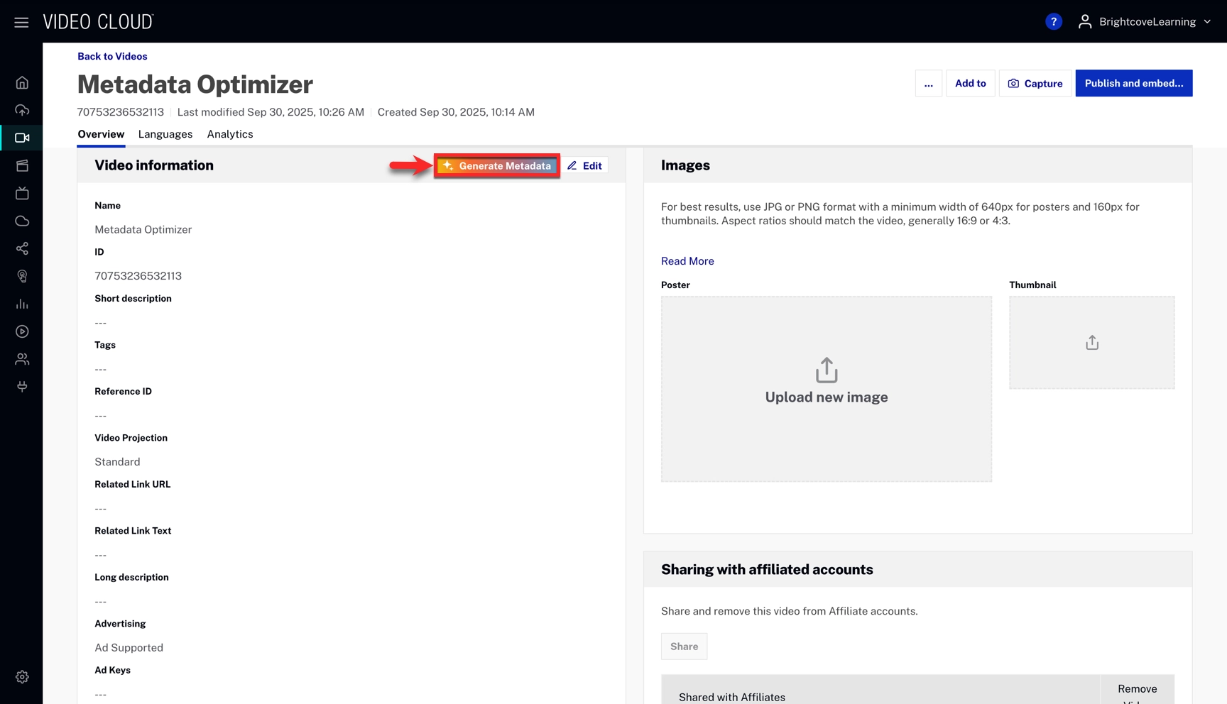 Optionally, provide reference sample videos in Video Cloud that reflect your preferred metadata style. The optimizer will use these samples to match formatting and tone.