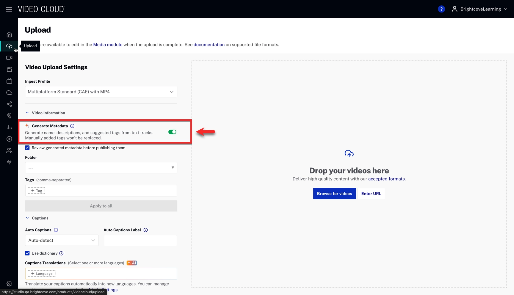 - On by default: Metadata will be generated automatically whenever you upload content unless you disable it on the Upload page.