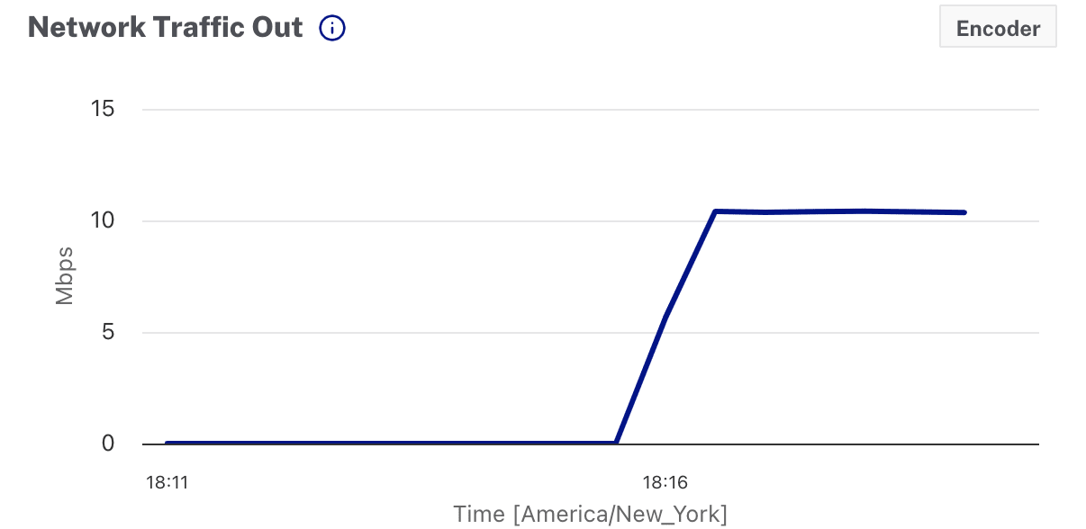 - Network Traffic Out - Rate of network traffic out of the encoder. This number includes all traffic from the encoder — the media output, NTP traffic, and DNS traffic. Even when the encoder is not delivering output, there will be some traffic.