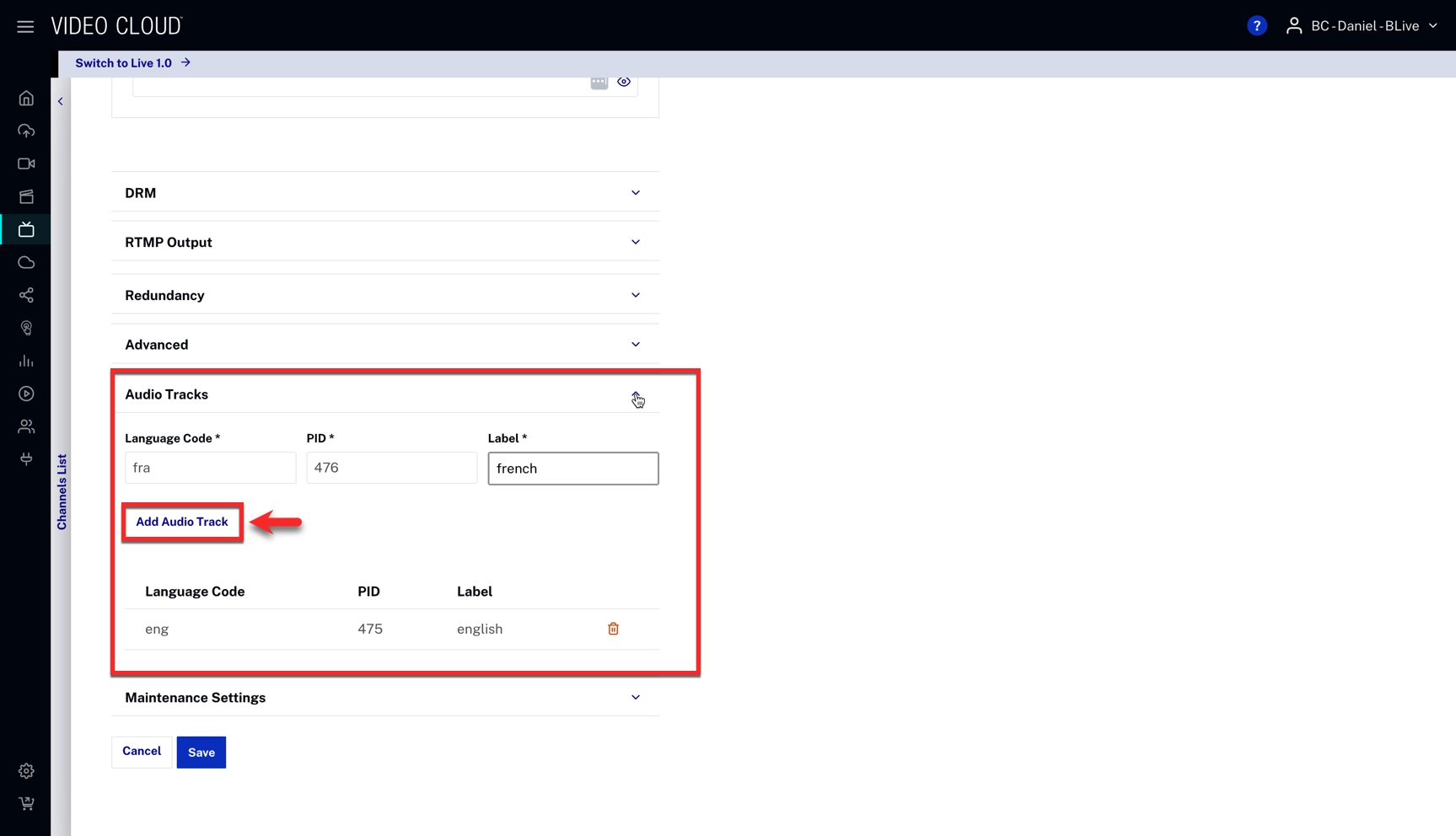 Below is an example of a request body for creating a Live Channel with multiple audio tracks: