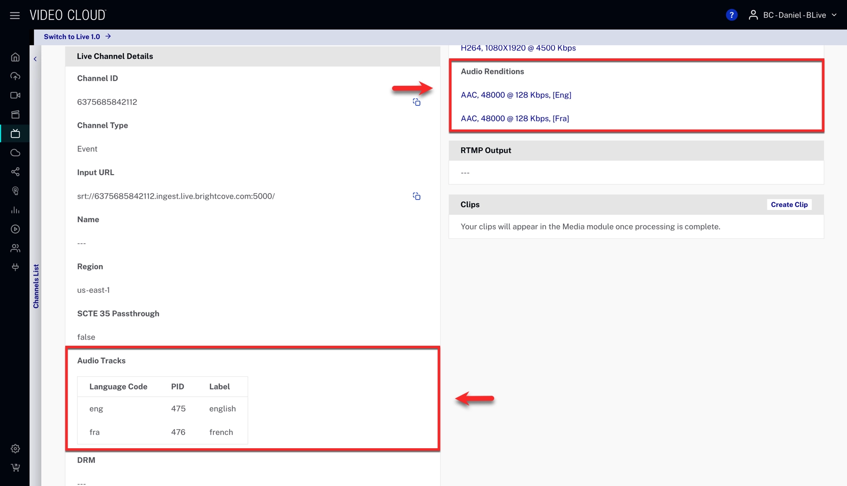 - You can see both your audio tracks and your audio renditions in the Live Channel Details and the Renditions section, respectively.